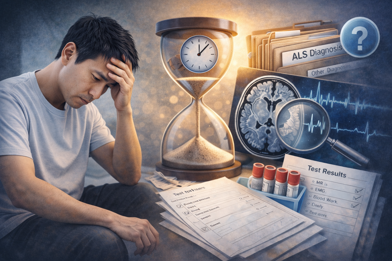 ALS(筋萎縮性側索硬化症)を心配して神経内科を受診したとき、「はっきりしたことはまだ言えない」「半年後にまた検査しましょう」と言われ、強い不安や苛立ちを感じる方は少なくありません。 「なぜ見つけてくれないのか?」「手遅れになるのではないか?」と焦るお気持ちは当然ですが、実はALSはがんのように「細胞を切り取って顕微鏡で見ればすぐに確定する病気」ではありません。 このページでは、なぜALSの診断に数ヶ月〜1年以上かかることが珍しくないのか、検査の流れ、そして「経過観察(時間)」そのものが極めて重要な診断プロセスである理由を論理的に整理します。