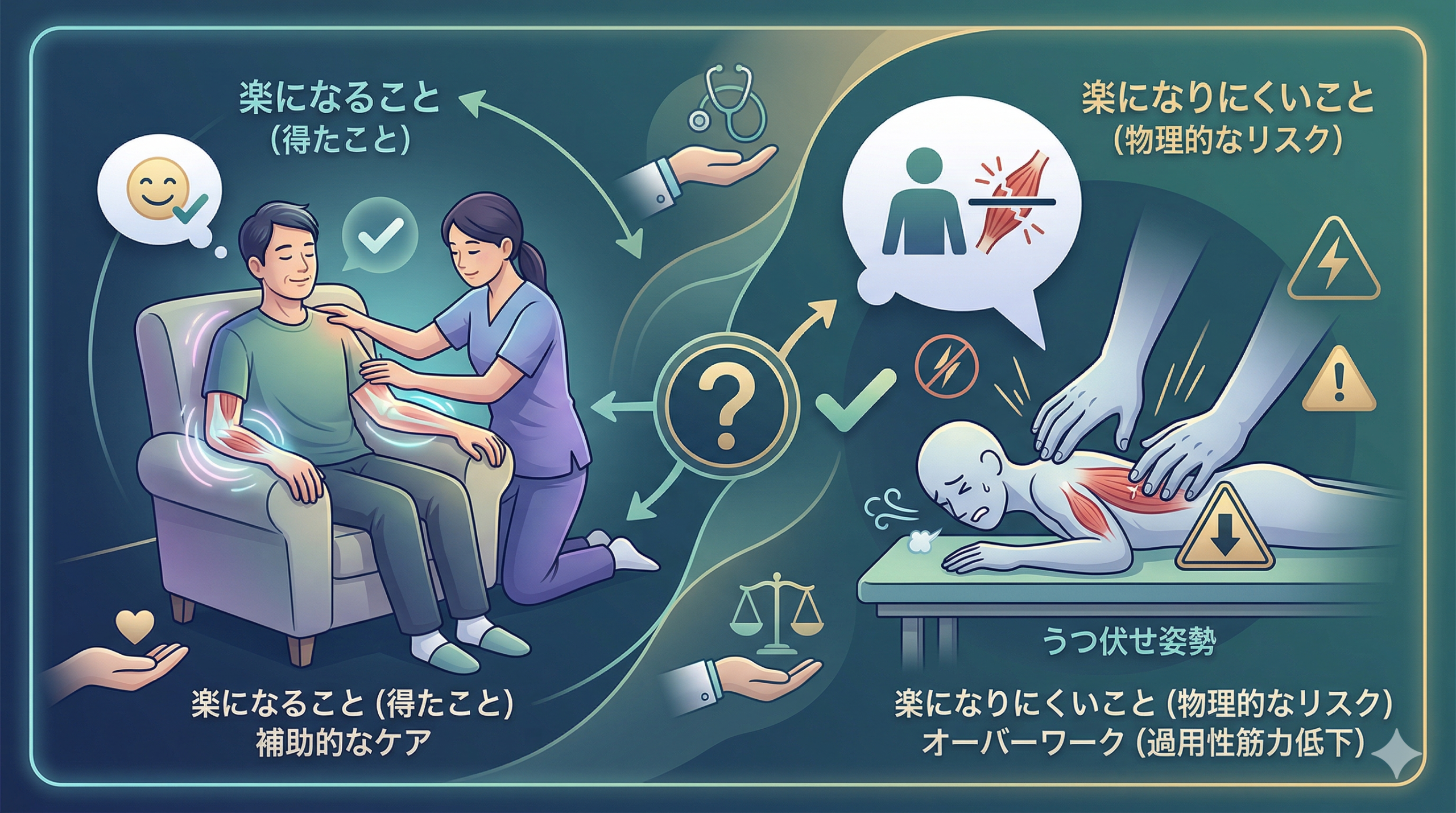 一方で、「病気を根本から変える魔法のアプローチ」ではないこと、そして「強いもみほぐし」や「うつ伏せ姿勢」がALSのクライアントにとっては重大なリスク(筋肉の破壊や呼吸苦)になることを理解しておく必要があります。