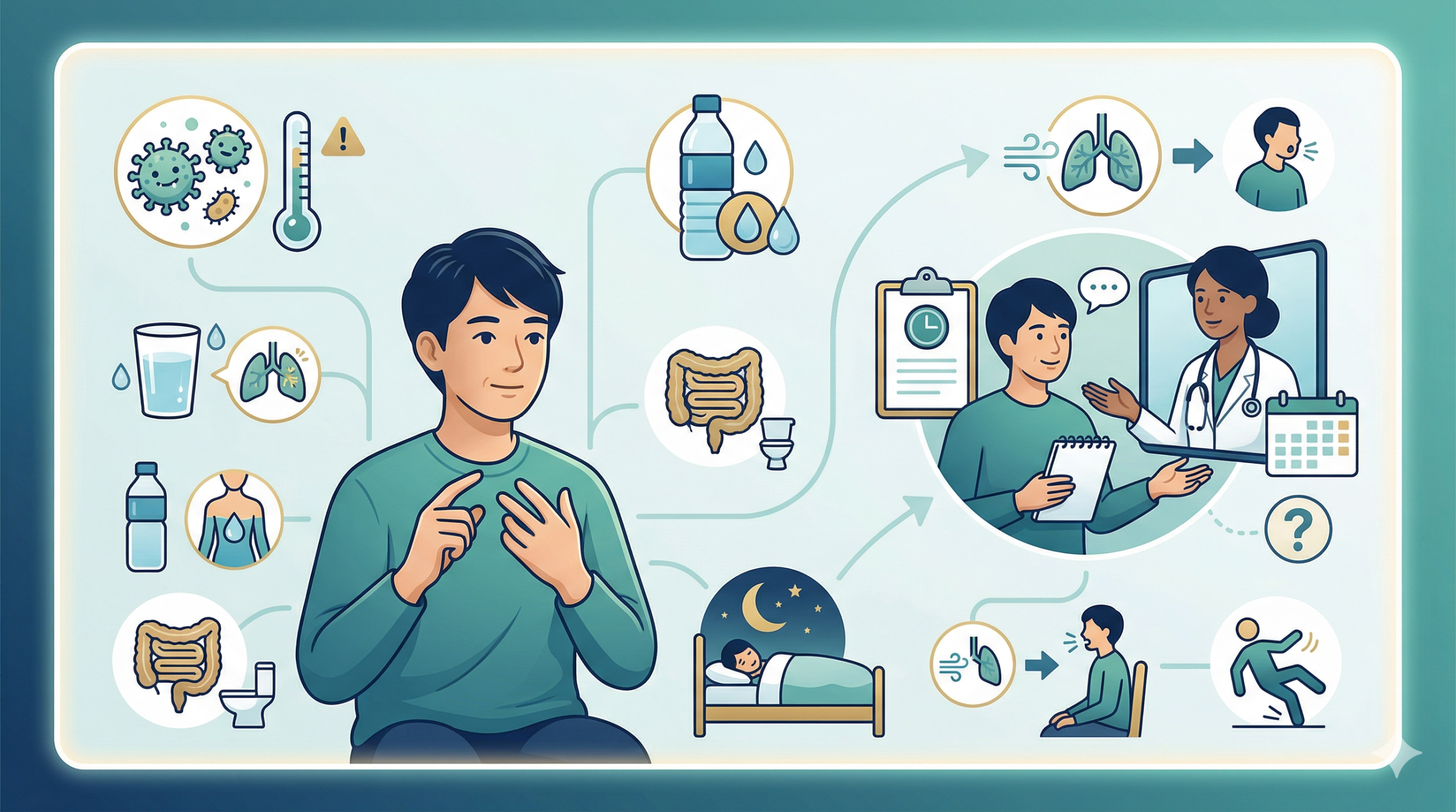 特に呼吸まわりの変化は急ぎやすいテーマで、横になると苦しい、朝の頭重感、痰の増加、会話困難などは見落としにくくしたいポイントです。