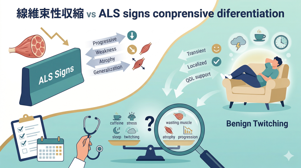 ALSが心配な方へ 筋肉のピクつき 良性との違い 筋肉のピクつきはALS?良性のピクつきとの違いを整理 筋肉のピクつきは、多くの人が一度は経験するありふれた症状です。 その一方で、ALSを心配して検索するきっかけにもなりやすく、不安が強くなりやすいテ... -
