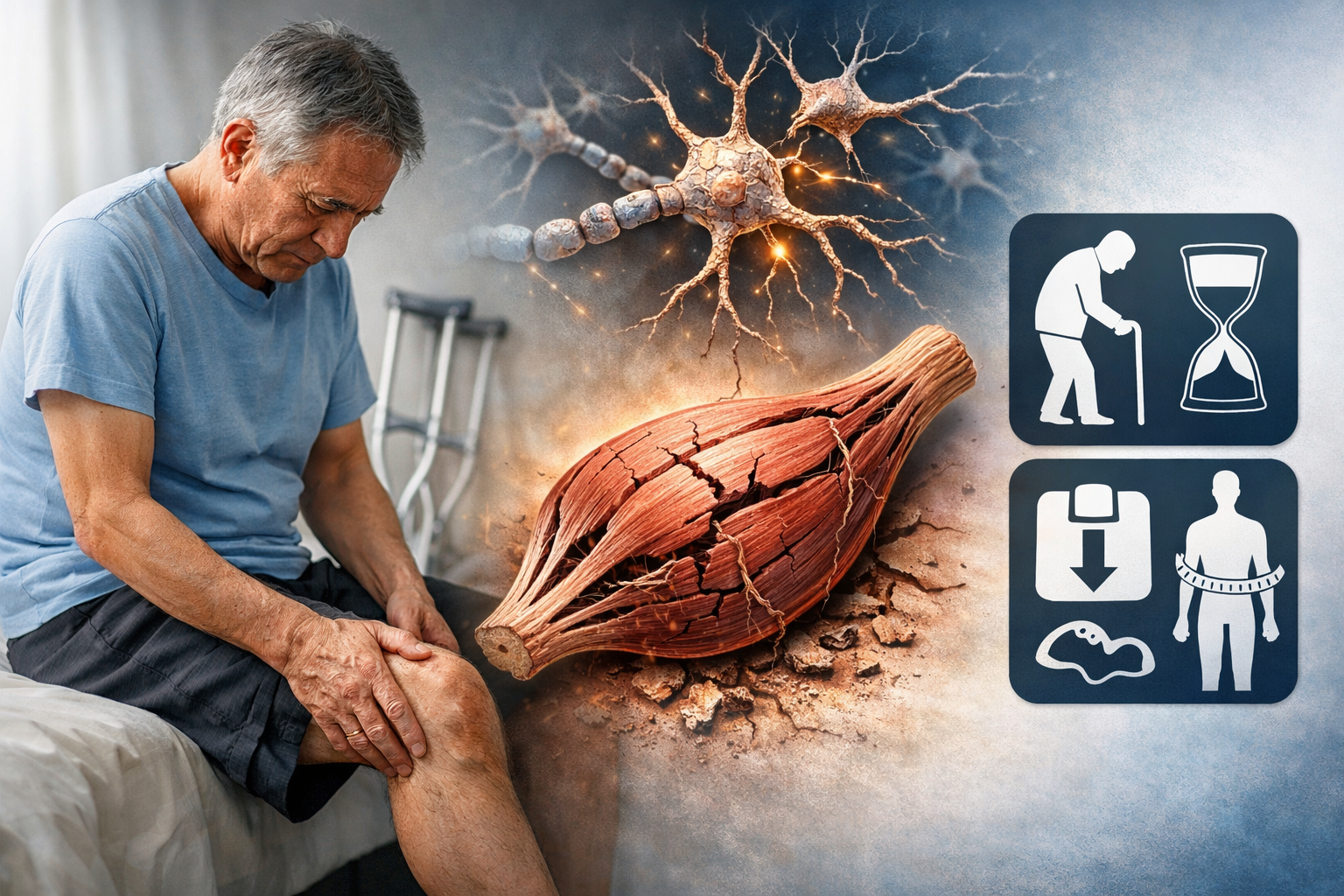 加齢による筋量低下(いわゆるサルコペニア)では、筋肉量だけでなく筋力や身体機能がゆっくり低下します。ただし、その変化はALSのように急に一部だけが動かなくなるというより、全体として少しずつ進むことが多くあります。
