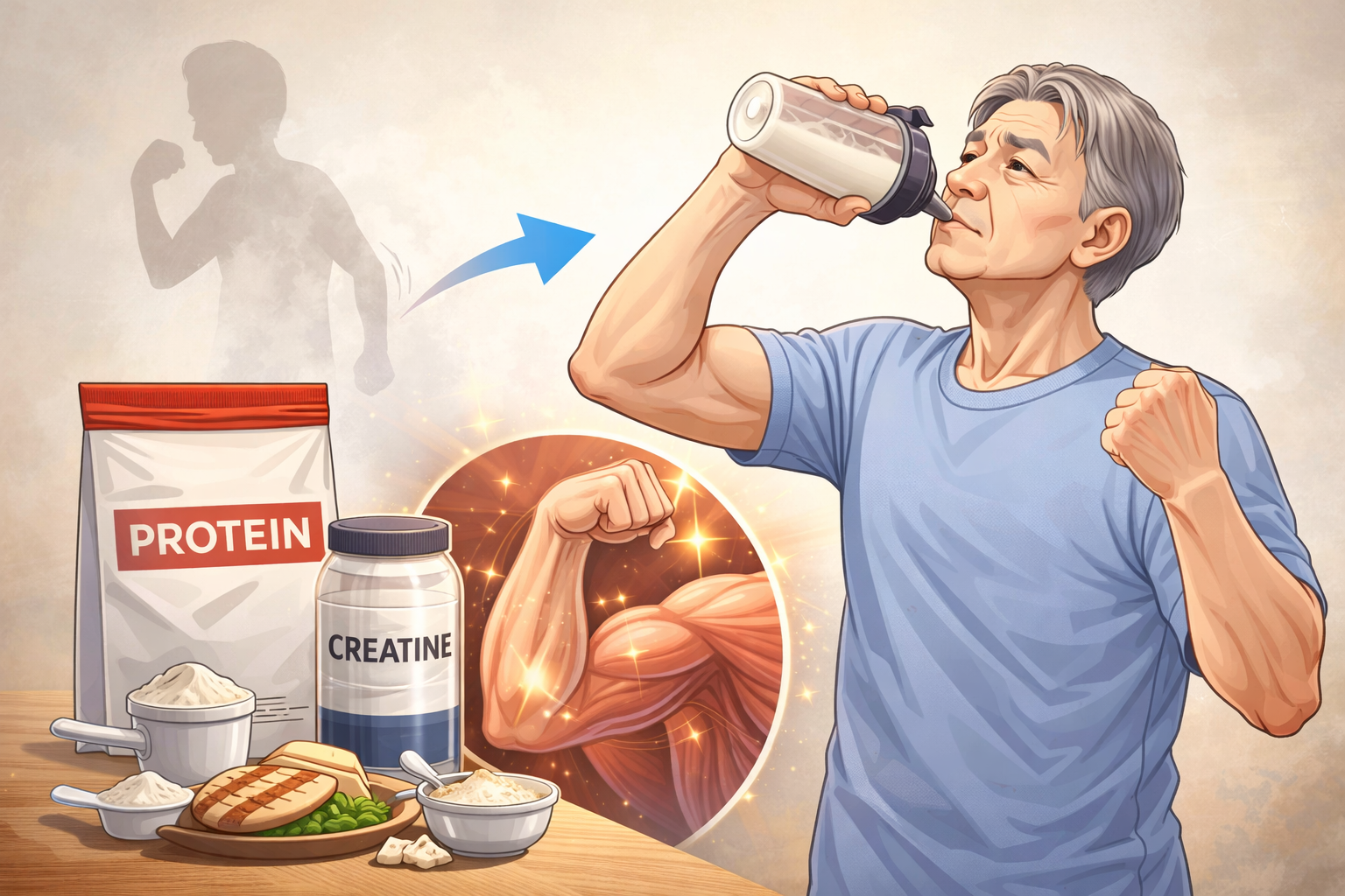 「プロテインとクレアチンを入れれば筋肉が守れる」とまでは言えず、生活全体の栄養状態と活動量を見ないと判断しにくいです。