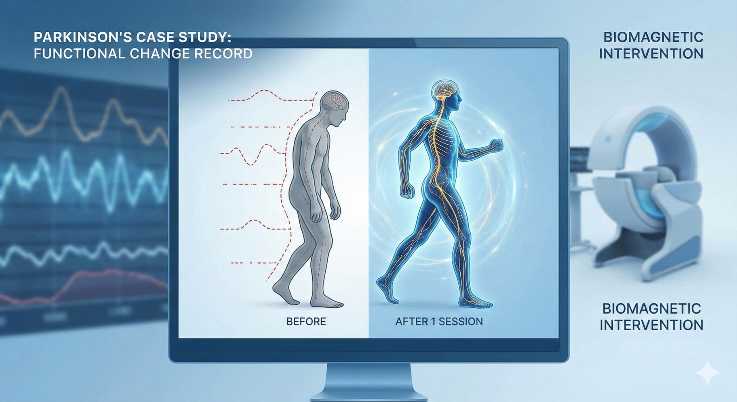 パーキンソン病における動作緩慢(ブラディキネジア)や起立困難に対する、生体磁気を用いた物理的介入の観察記録です。 独自の物理的介入(約60分)を実施し、その前後における起立動作の効率、および歩行・言語反応速度の物理的な推移を記録しています。