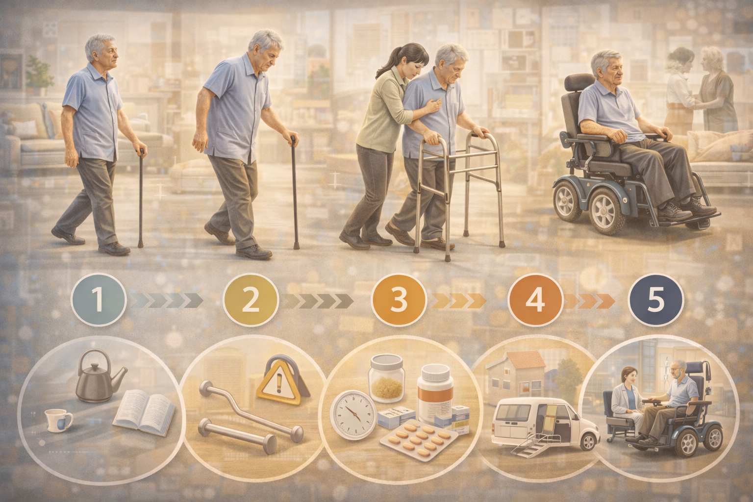 「転倒リスク」が実務上の最大の懸念となります。住宅改修や福祉用具の導入、すくみ足対策など、安全を確保しながら自立を保つ戦略へシフトします。